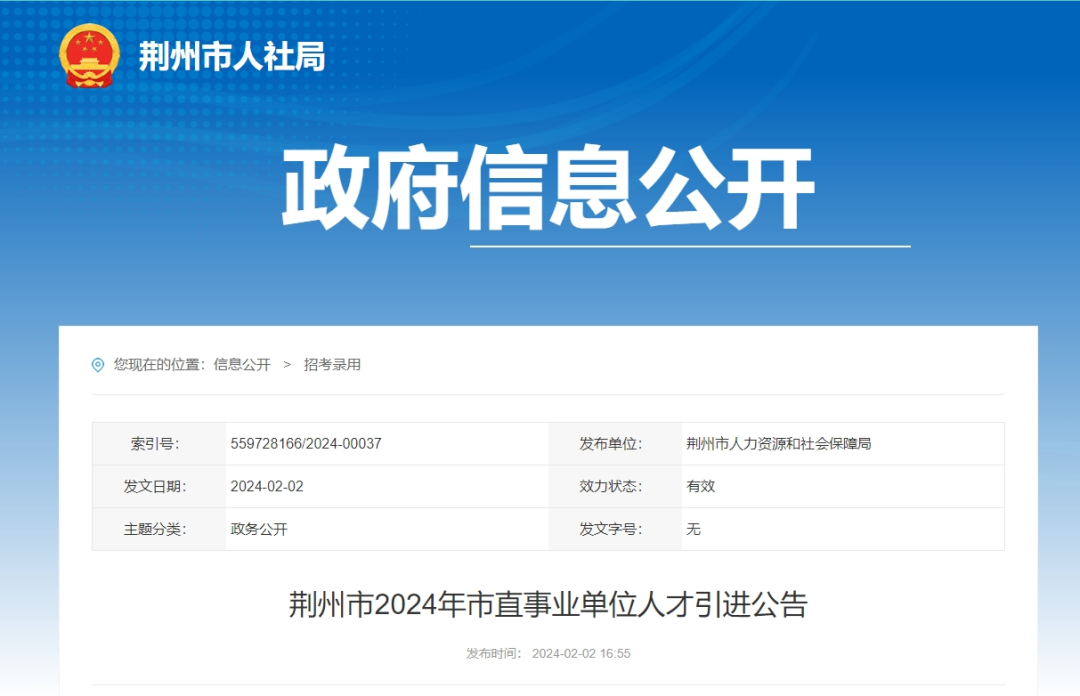 2月2日,荆州市人力资源和社会保障局发布荆州市2024年人才引进公告。