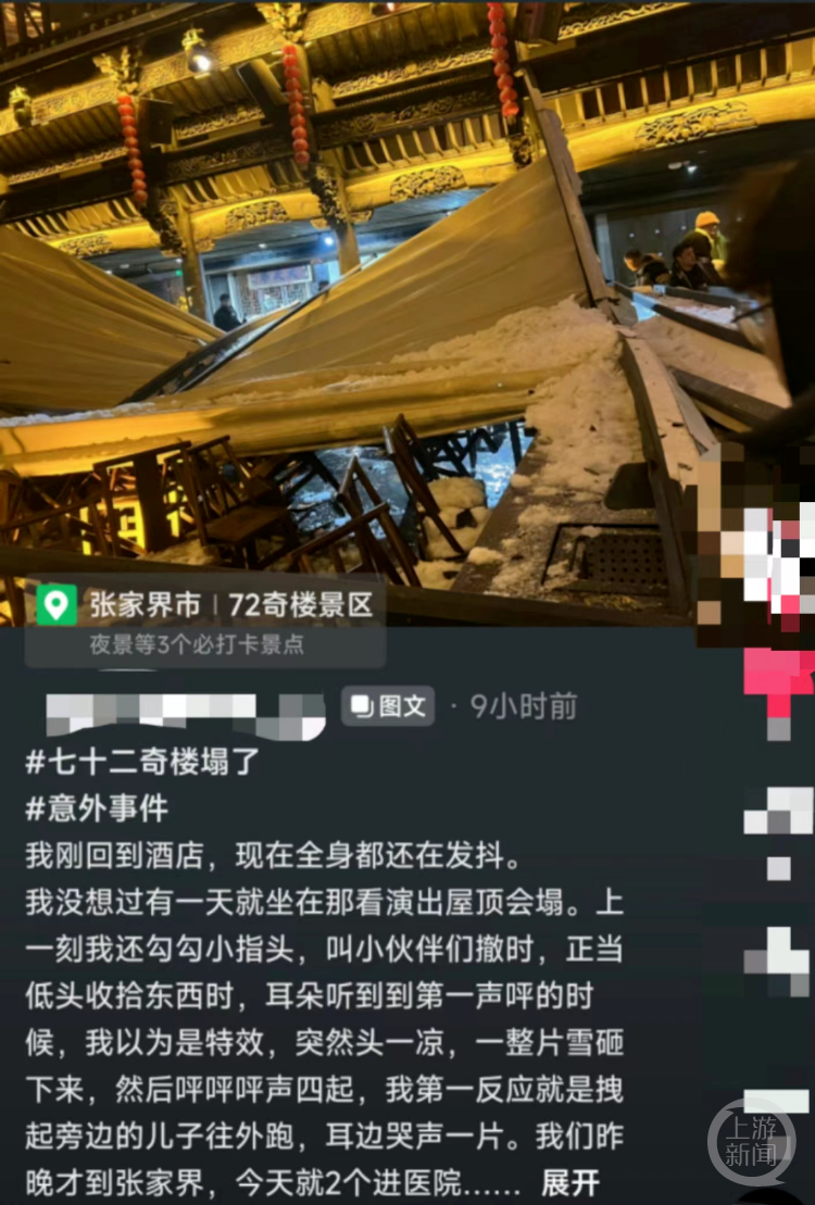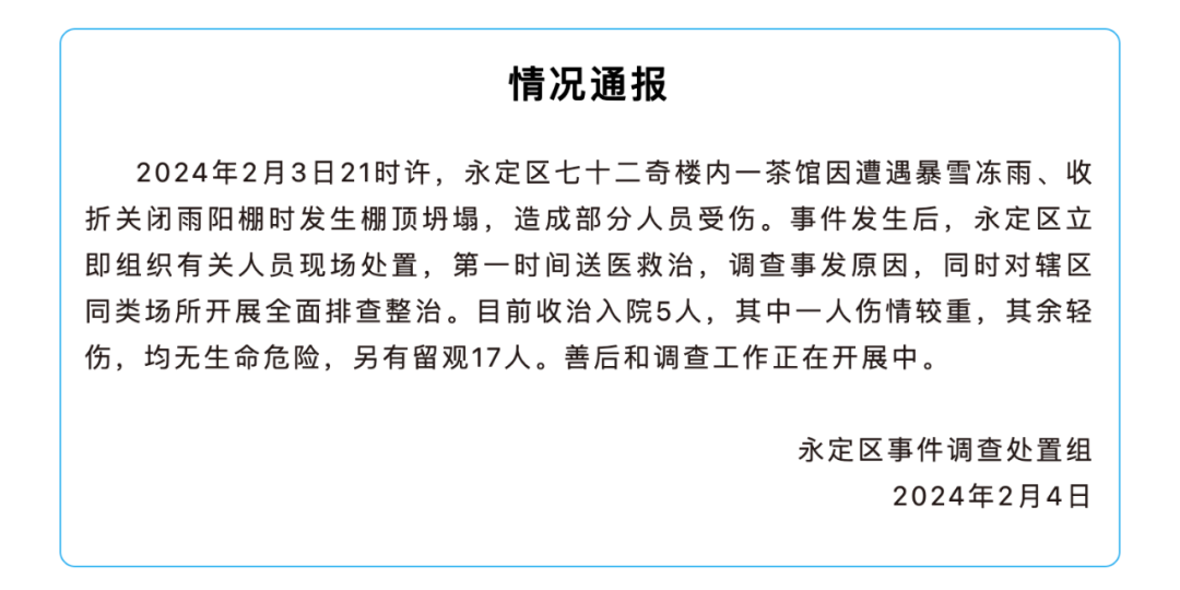 2024年2月3日21时许,永定区七十二奇楼内一茶馆因遭遇暴雪冻雨、收折关闭雨阳棚时发生棚顶坍塌,造成部分人员受伤。事件发生后,永定区立即组织有关人员现场处置,第一时间送医救治,调查事发原因,同时对辖区同类场所开展全面排查整治。目前收治入院5人,其中一人伤情较重,其余轻伤,均无生命危险,另有留观17人。善后和调查工作正在开展中。