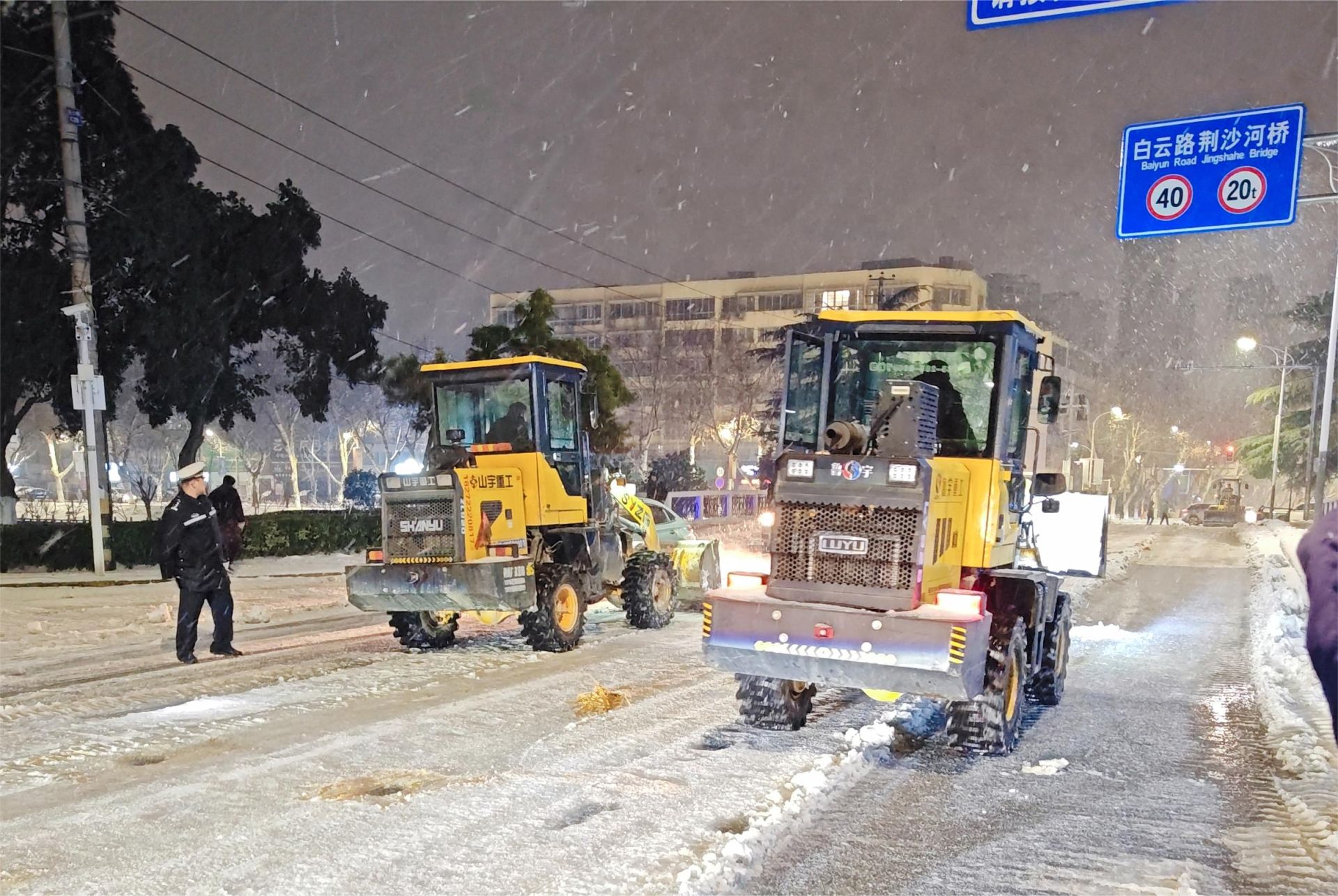 19∶00,城管人员继续夜巡,实时监测积雪结冰隐患区域。环卫工人配合清雪机械作业,昼夜不歇全力清障。