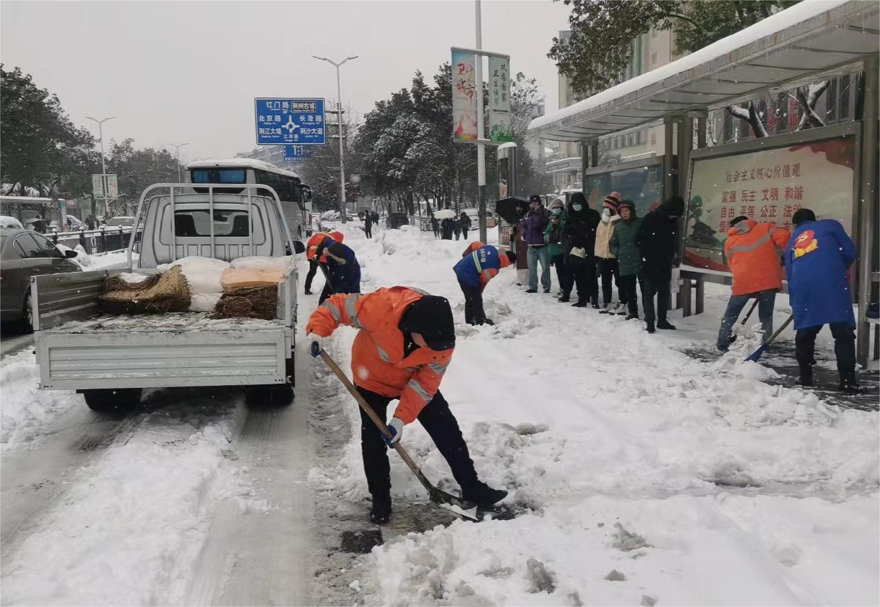 7∶00,沙市区城管执法局对城区主干道、各桥梁和滑坡处、公交站台、医院、市场进行除雪人员和设备的调整部署,工作人员上路持续巡查。