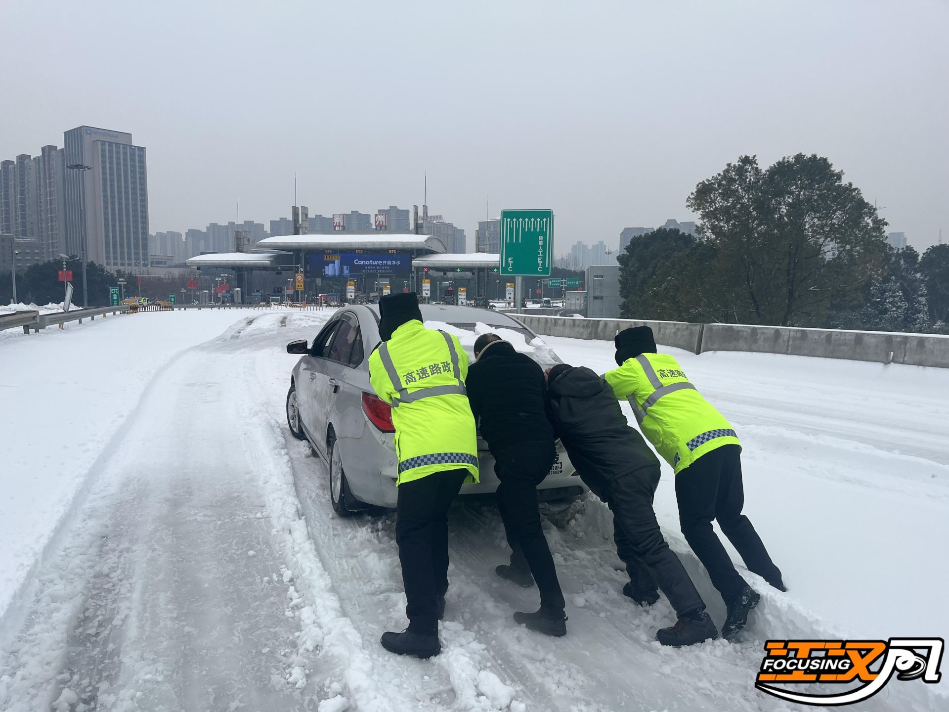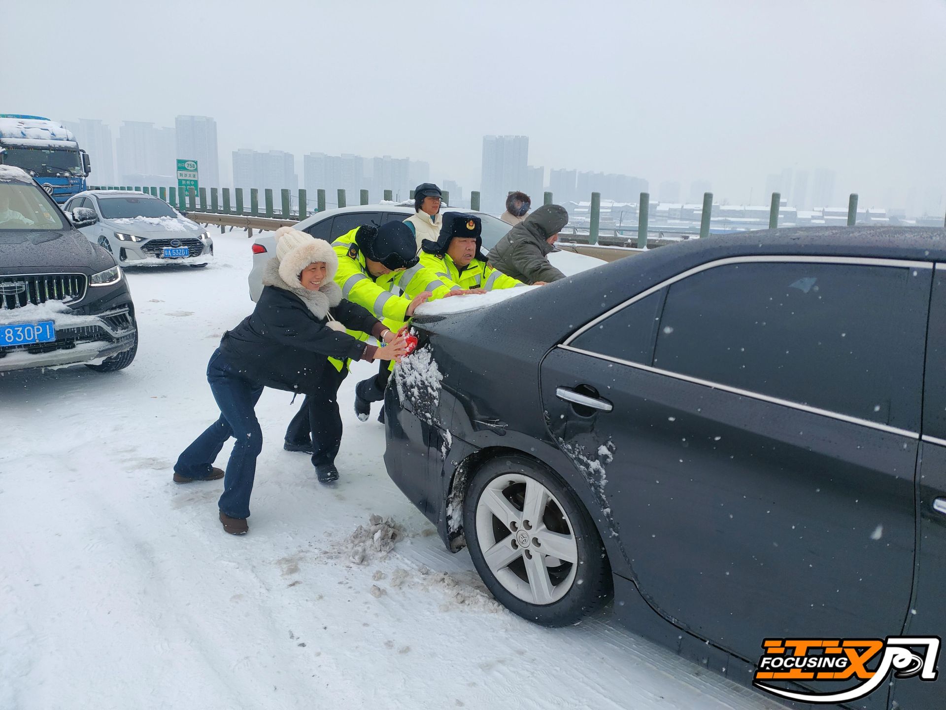 其中,路政执法人员彻夜值守在高速一线,督促养护部门对重点路段持续进行多次融雪剂撒布,出动各类应急作业车辆,对易结冰路段进行压速引导通行,帮助每一辆抛锚车辆安全下高速,全力护航广大人民群众风雪回家路。