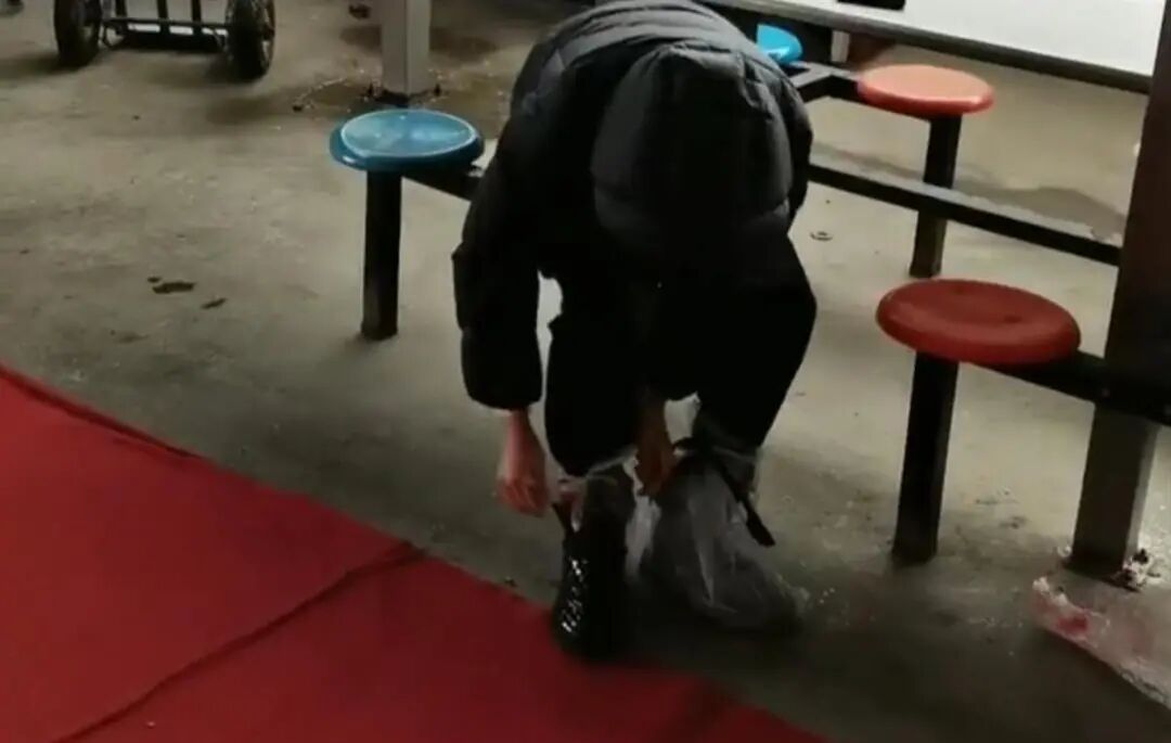 有旅客使用养老院提供的塑料袋套在鞋上(视频截图)