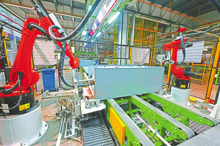 时近春节,美的冰箱荆州工厂各生产线忙个不停,一排排机械手臂来回翻转组装零部件,一台台半成品冰箱乘坐电梯,穿过空中廊道进入下一道工序。