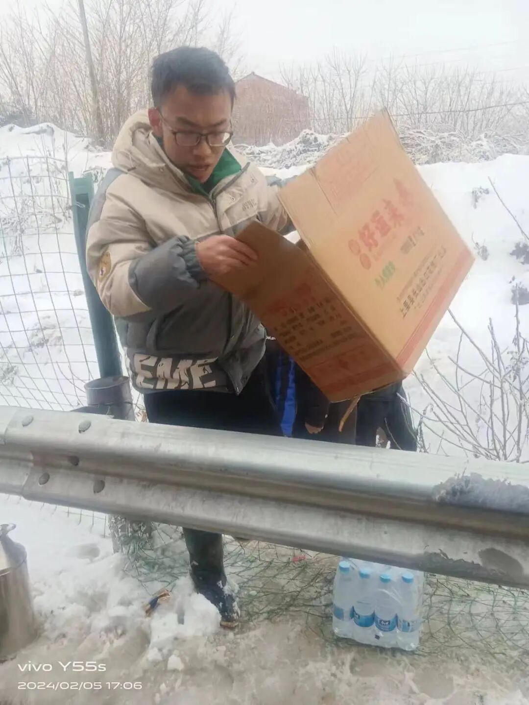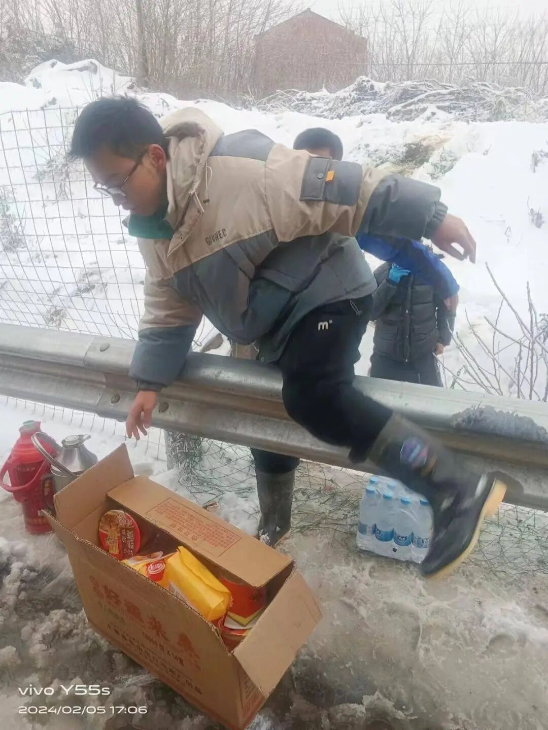 当日下午母子俩来来回回十多趟为高速上的滞留旅客送去食物和水在冰天雪地中二人忙出一身热汗。