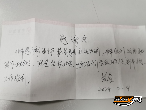 2月4日,受暴雪冻雨影响,荆州城区大部分道路受阻,现金尾箱无法送达,当日荆州市内金融机构均无法受理柜面现金业务,招行也不例外。客户饶先生来到荆州分行营业部,表示有一笔大额现金急需存入对公账户,客户的诉求就是招行努力的方向。荆州分行应急业务处理小组积极与上级行沟通,请求业务指导,并多方协调尾箱寄库行、押运公司,最终多方达成一致,同意为该行特殊安排该笔现金存入后的尾箱押运入库。网点高效为客户办理了现金存款,客户对该行服务表示非常认可,并主动提出表扬写下感谢信。