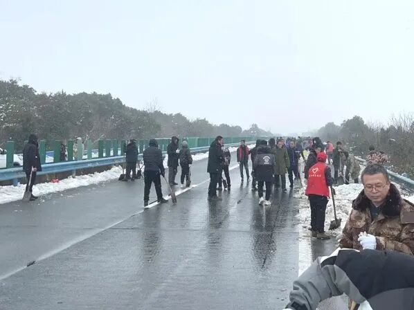 党员干部凌晨集结出动,为大家分发铲雪物资。2月6日,马山镇全体党员、干部职工、志愿者凌晨集结出动,到车马阵高速路段开展“铲雪除冰”,400多人凝心聚力畅交通。风雪中,“志愿红”为大家分发防护手套、纯净水,为铲雪队伍提供坚强有力的后勤保障。领完铲雪物资后,大家顶着寒风,手持铁铲、扫帚等工具,扫雪的扫雪,铲冰的铲冰,分工明确、配合默契、干劲十足。铁锹、扫帚与地面的“呲呲”声、“沙沙”声此起彼伏,除雪场面热火朝天,构成了皑皑白雪中最耀眼的一道风景线。