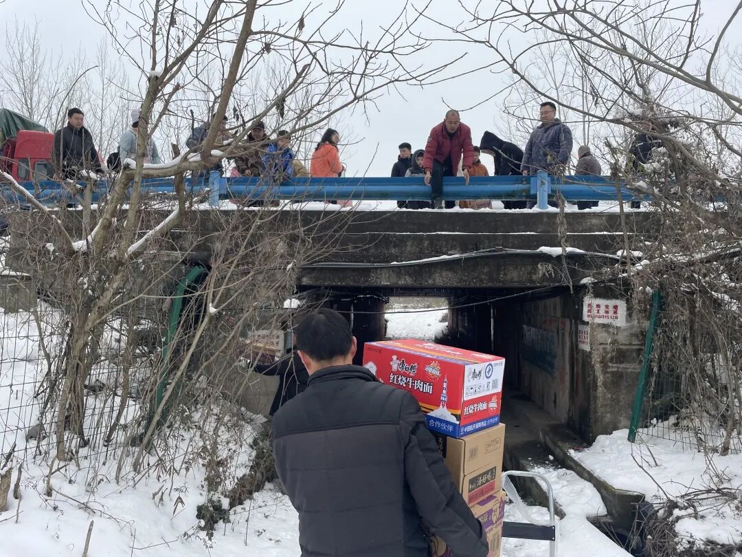 2月3日,受大风降雪等极端天气影响,荆州区高速路段进行交通管制。许多大货车滞留在八岭山车马阵高速路口,排起了长队,不少司机车内补给不足,饮食成为难题。2月3日下午,居住在车马阵高速路口附近的朱家岭村热心村民自发为滞留的货车司机做饭送菜,展现了善良和情义。