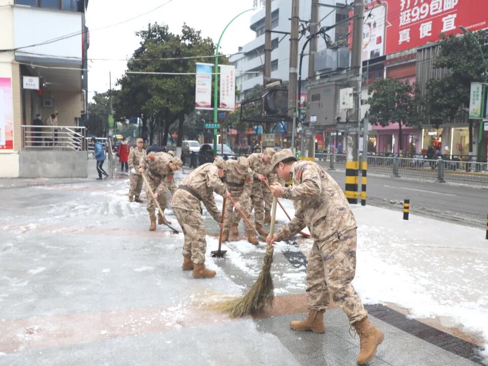 暴雪纷飞,道路结冰。临近年关,荆州市荆州区迎来今年最强寒潮和低温雨雪冰冻天气,为保证人民群众节前的出行便利,荆州市荆州区人武部“以雪为令”,连日来组织官兵、民兵开展破冰除雪活动。