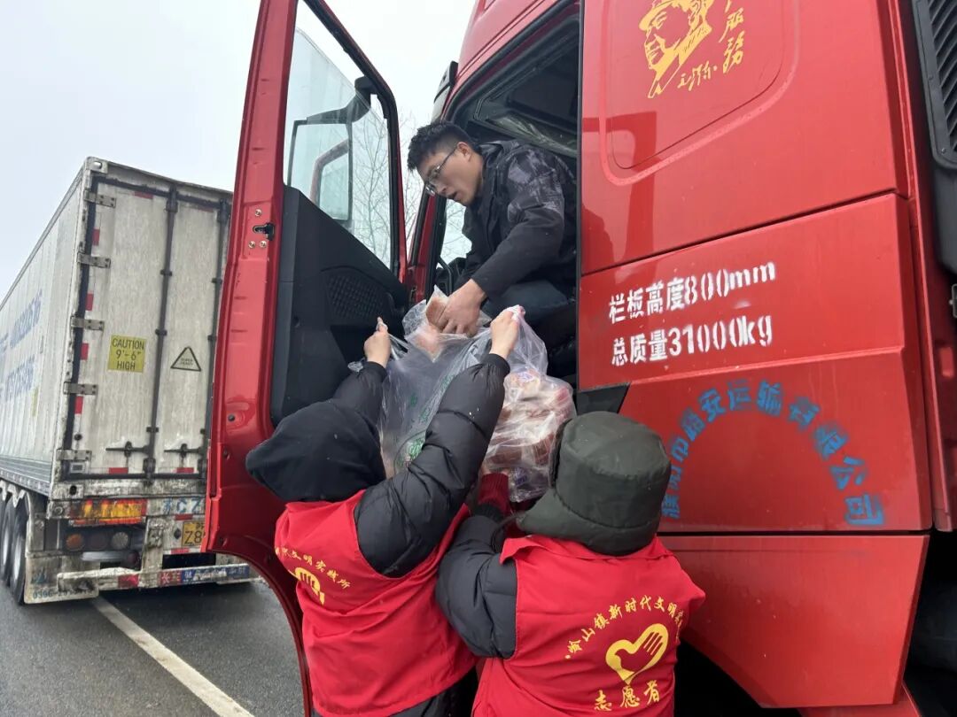 八岭山镇组织志愿者为高速滞留旅客送上面包。(付翠霞摄)