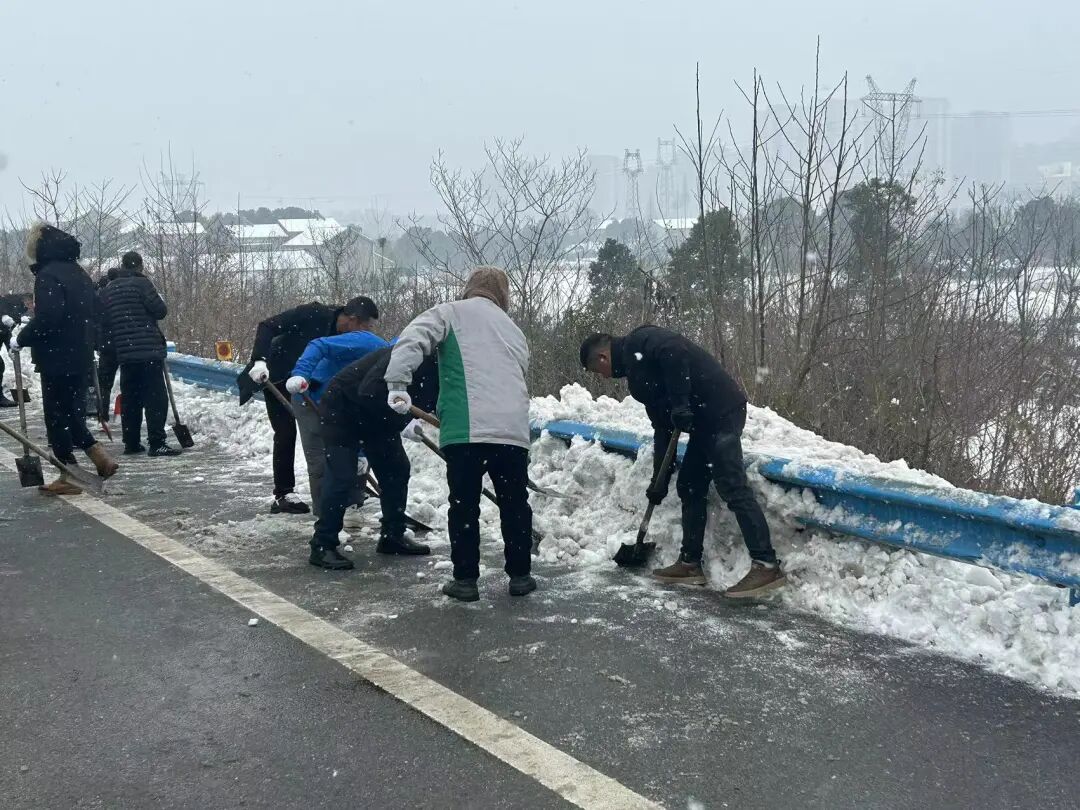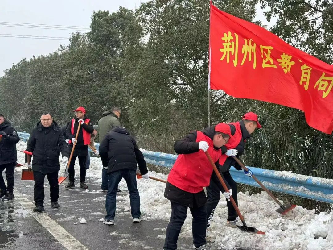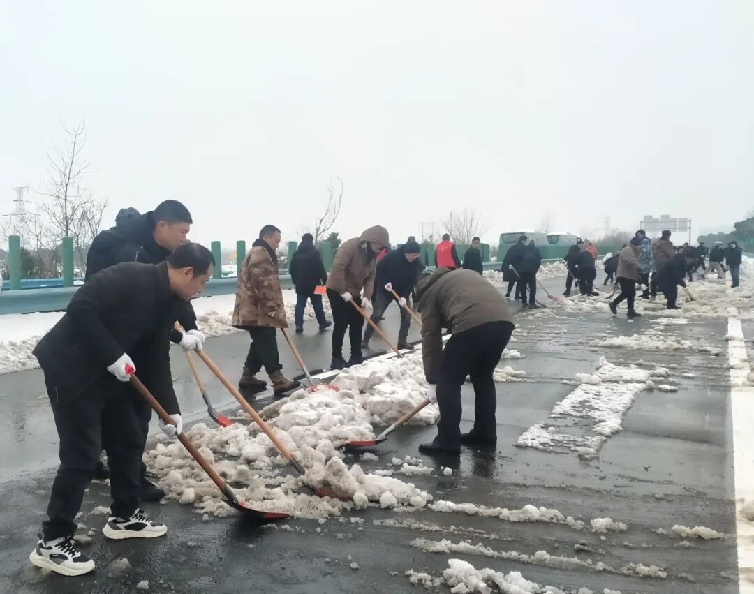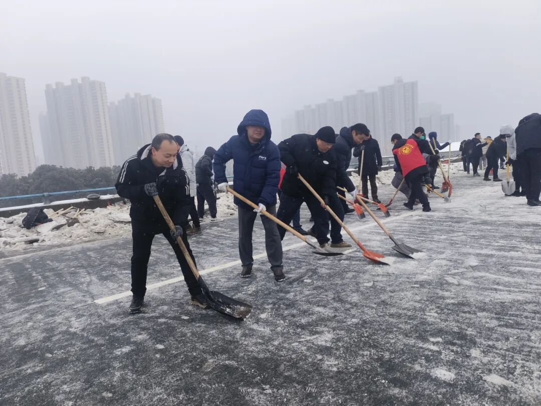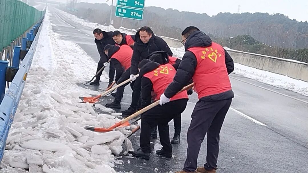 西城街道郢都路社区组织志愿者在沪渝高速开展铲雪除冰行动。
