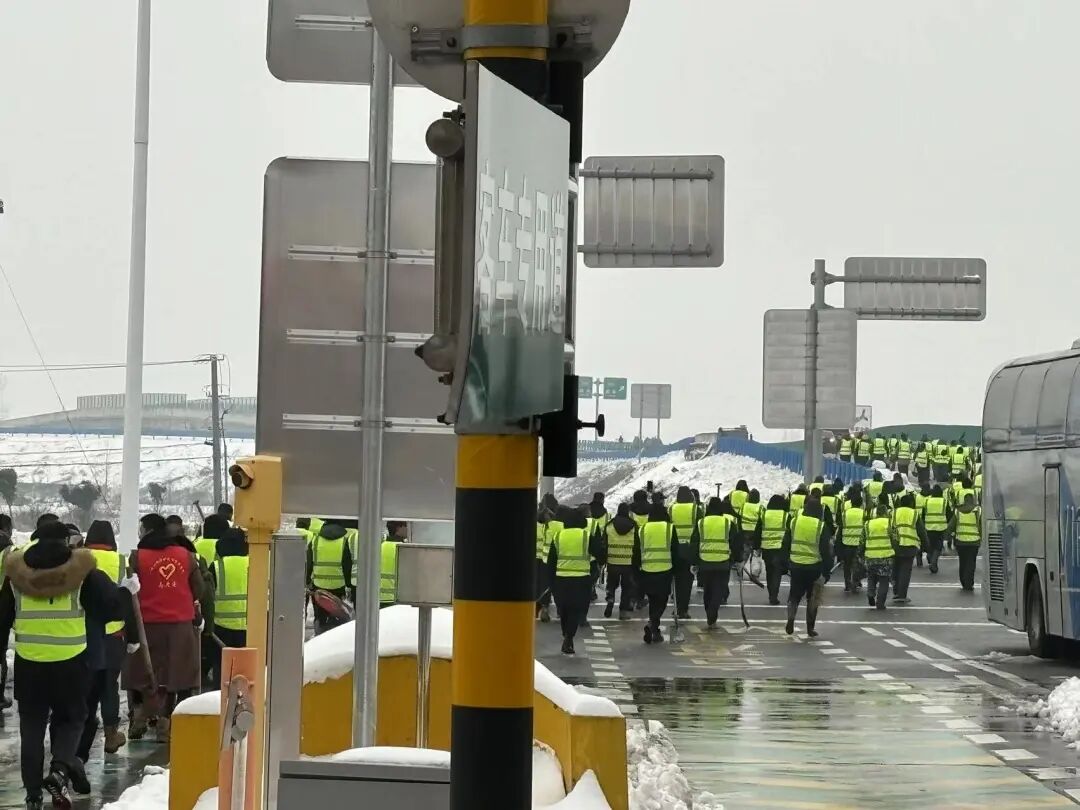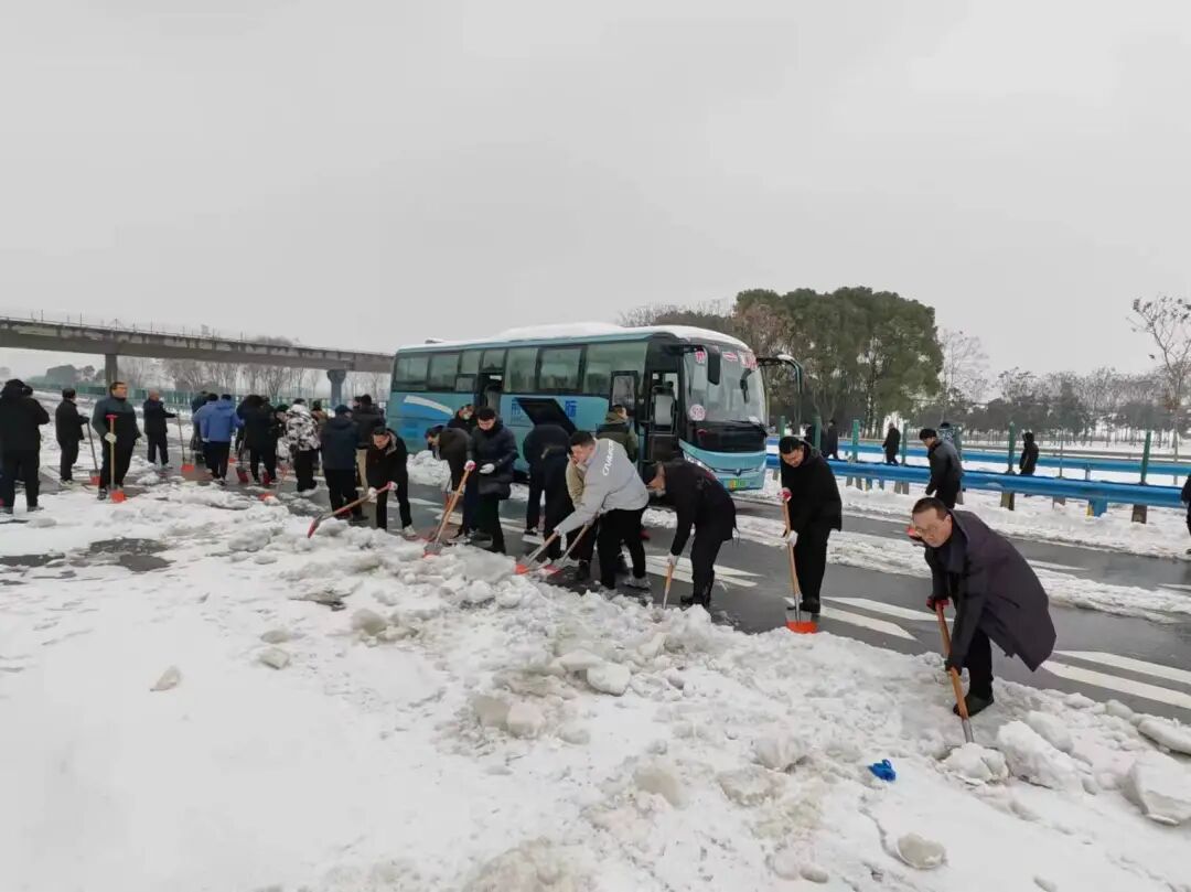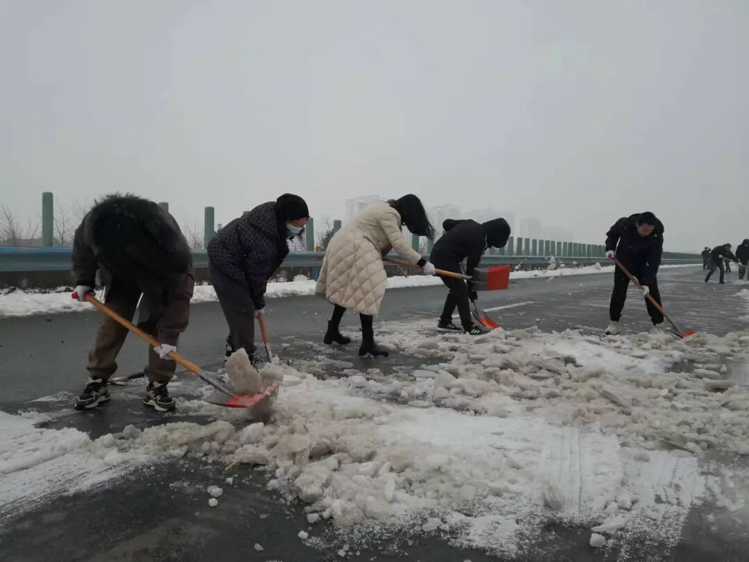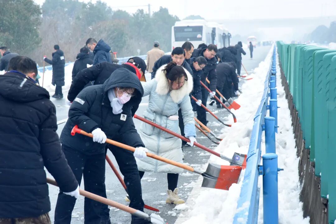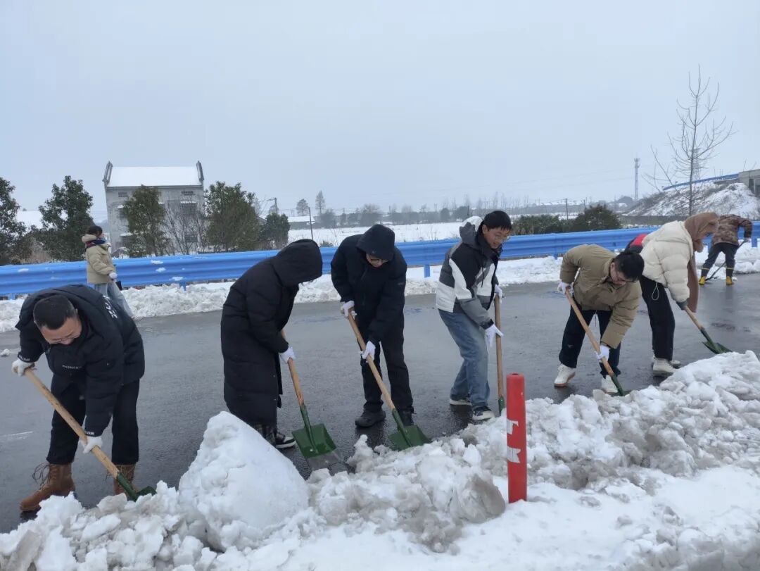 西城街道郢都路社区组织志愿者在沪渝高速开展铲雪除冰行动。