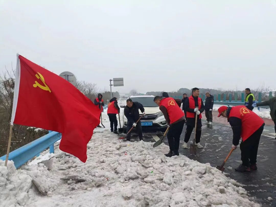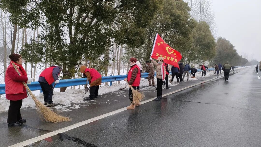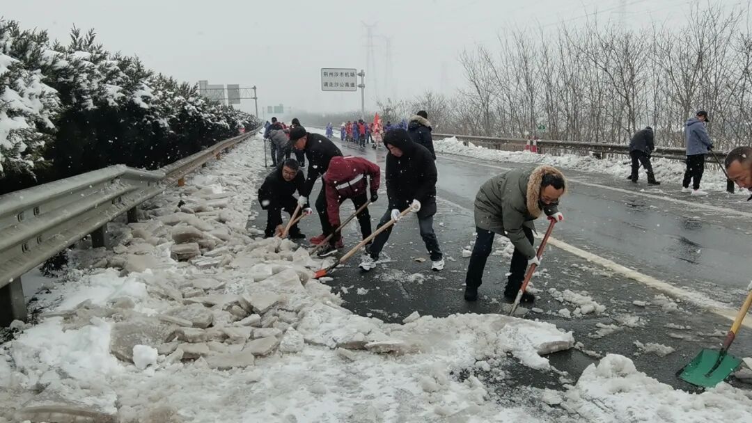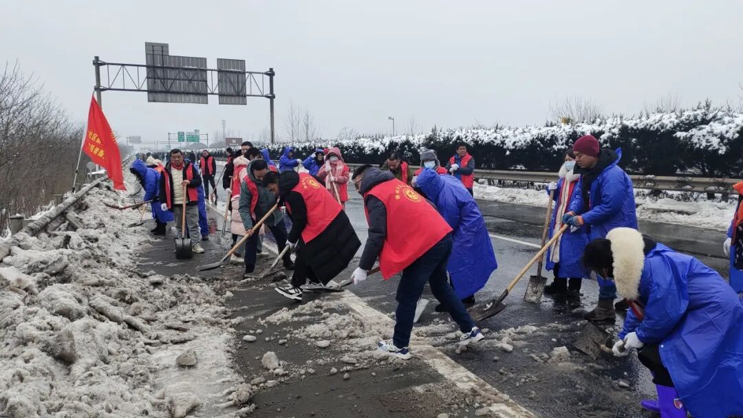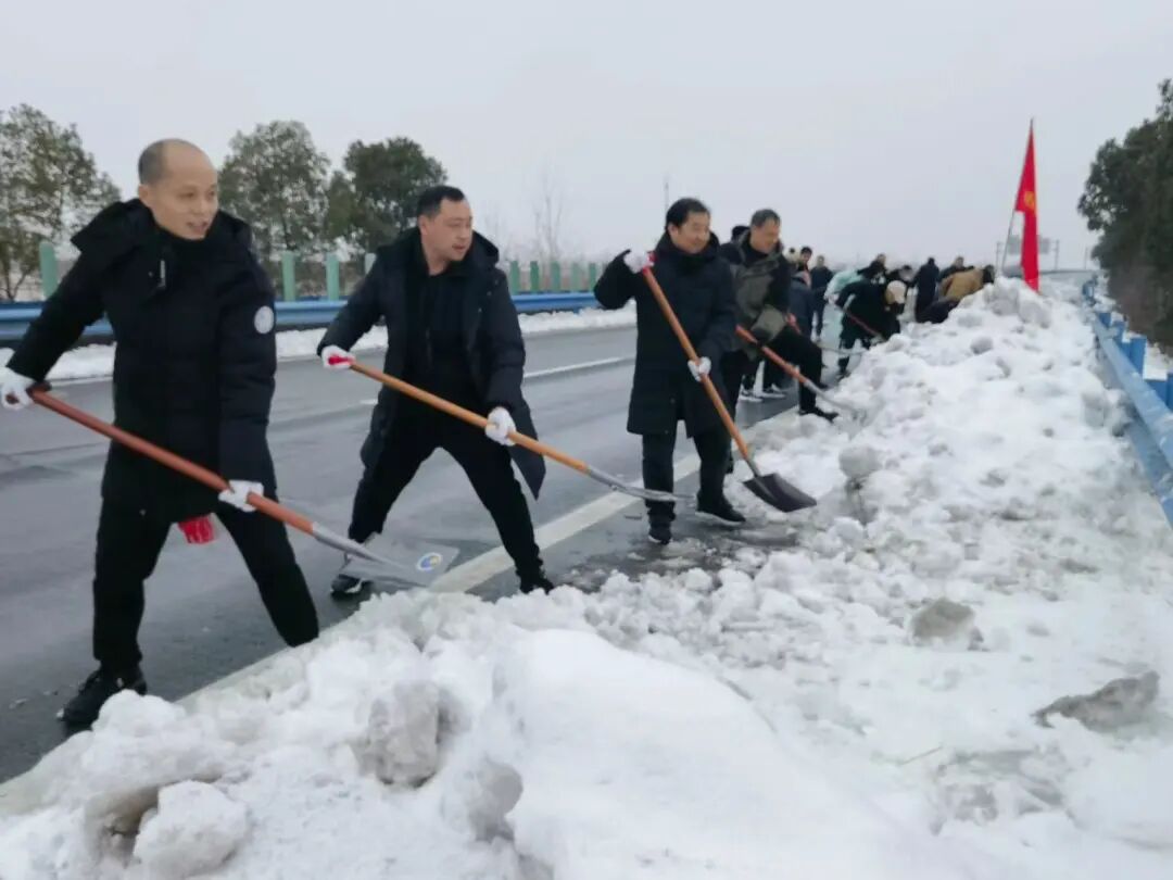 郢城镇新生村党支部集结无职党员、志愿者到高速路段进行人工铲雪。