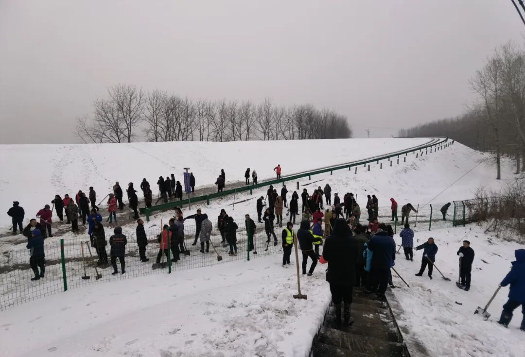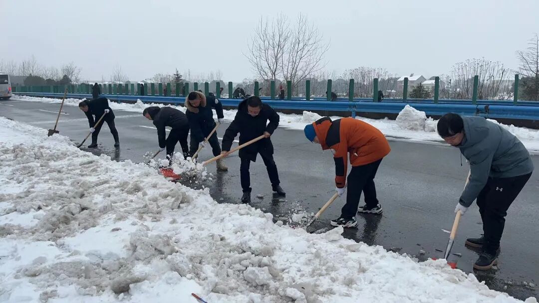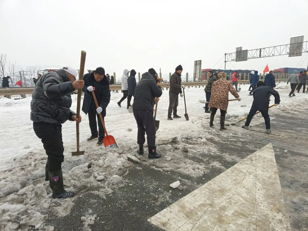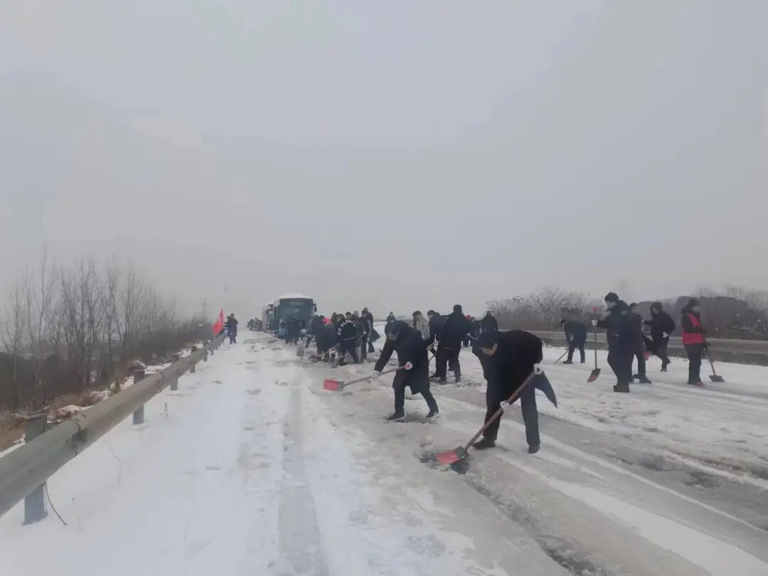 郢城镇新生村党支部集结无职党员、志愿者到高速路段进行人工铲雪。