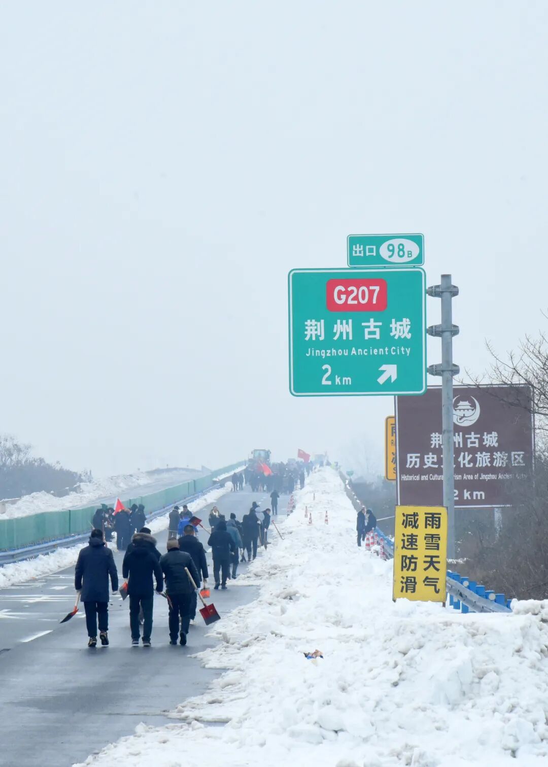 川店镇组织党员、群众、志愿者在荆州中高速开展铲雪除冰行动。(陈帮特摄)