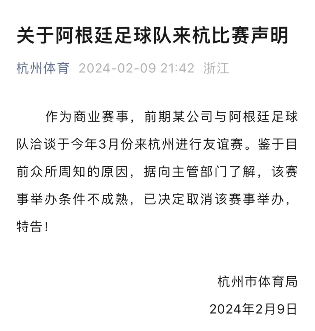 杭州体育局:阿根廷足球队来杭比赛取消 2024-02-09 22:34 0 杭州市体育局2月9日发布《关于阿根廷足球队来杭比赛声明》: 作为商业赛事,前期某公司与阿根廷足球队洽谈于今年3月份来杭州进行友谊赛。鉴于目前众所周知的原因,据向主管部门了解,该赛事举办条件不成熟,已决定取消该赛事举办,特告!