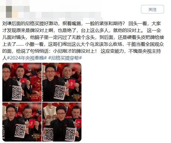 也有网友称赞撒贝宁当着全国观众说的那句“悄悄话”:小尼刚才的牌没对上。“这应变能力,不愧是央视主持人。”