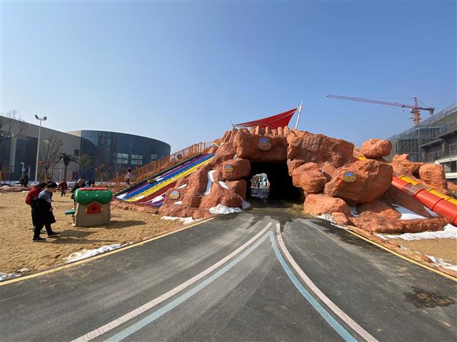 顺着民俗文化节主舞台往前走100米左右,就是奇趣海岛乐园,初一至初八,大家可以免费畅玩。水母乐园、旋转自行车、蹦蹦云等五十余项目玩不停。