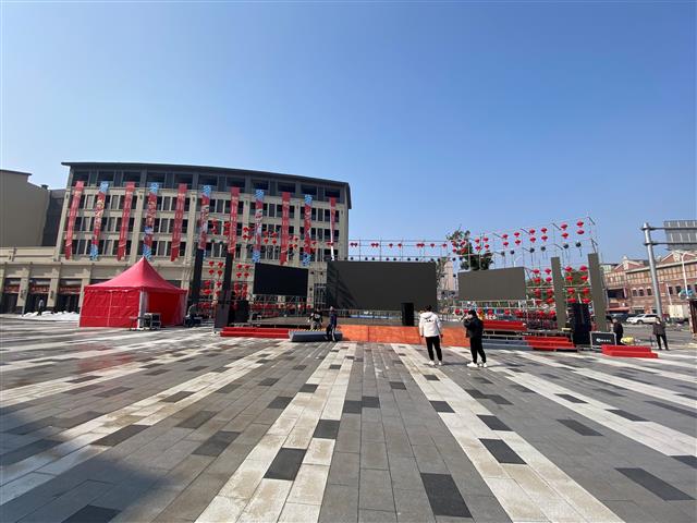 明天上午10点,2024荆州海洋世界第一届“金龙贺岁·楚韵腾飞”民俗文化节将在荆州小梅沙海洋馆对面的广场举行,届时活动丰富精彩,今天(2月11日)上午,工作人员正在搭建舞台。