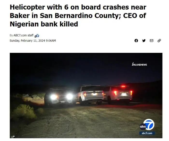 图片来源:美国广播公司(ABC)报道截图 据美国《纽约时报》报道,美国联邦航空管理局称这架坠毁的直升机为EC-130型直升机,并表示将与国家运输安全委员会一起对这起事故展开调查。 美国广播公司下属的KABC报道称,这架飞机当时正飞往内华达州拉斯维加斯以南的博尔德市。尚不清楚坠机原因。 另据彭博社报道,该直升机的乘客中包括尼日利亚资产规模最大的银行之一Access银行联合创始人赫伯特·维格(Herbert Wigwe)。 报道称,尼日利亚前财政部长、世界贸易组织总干事恩戈齐·奥孔乔-伊维拉10日证实了消息。“听到赫伯特·维格不幸去世的消息,我感到非常悲痛……他的妻子和儿子等人在直升机坠毁中丧生。愿逝者的灵魂安息。”