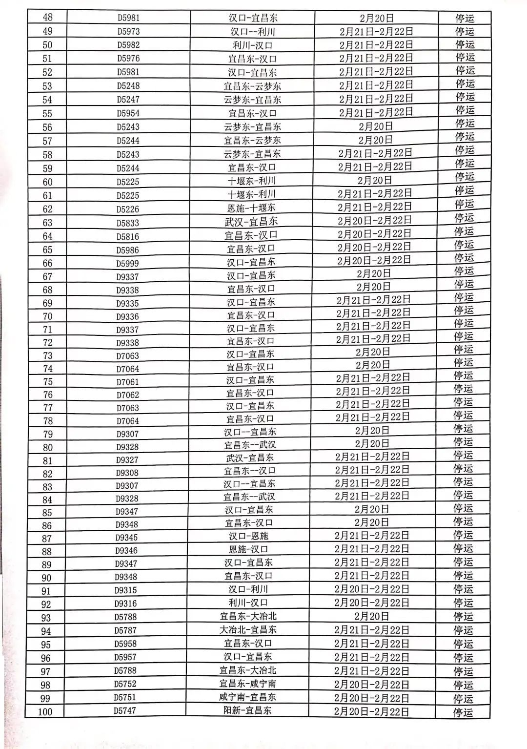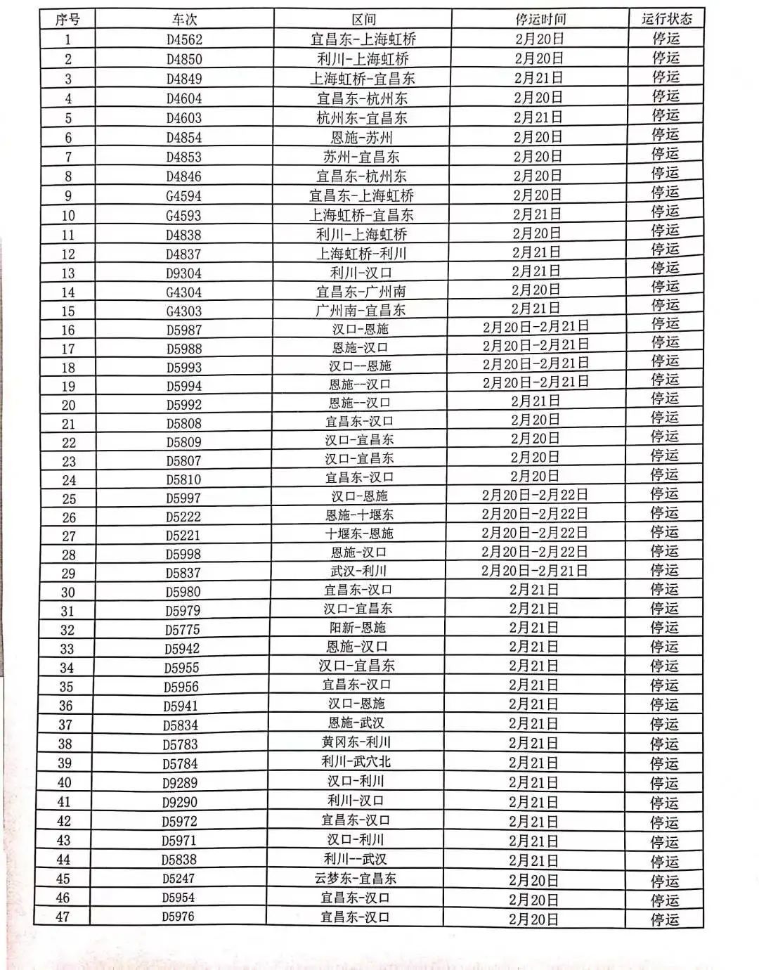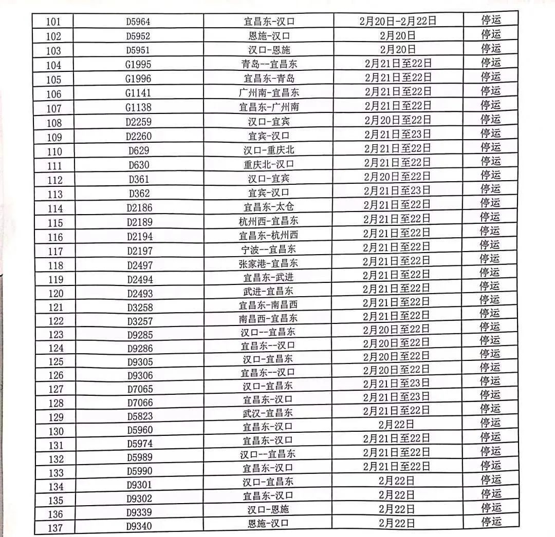 据@武汉铁路 最新消息,根据中央气象台发布的寒潮橙色预警,2月18日至24日,我国大部地区将出现大范围雨雪冰冻天气。为确保旅客出行安全,中国铁路武汉局集团有限公司2月20日计划停运部分列车。