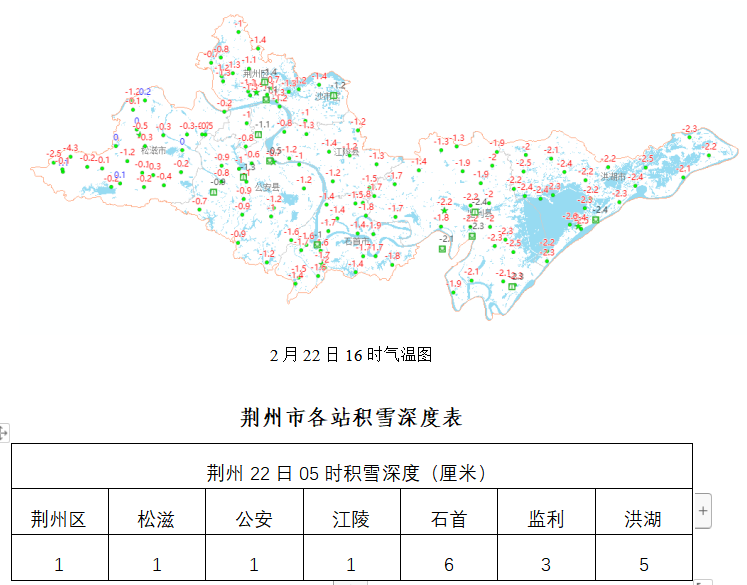 目前,我市气温在-4.3~1.1℃,全市大部地区阴天,全市积雪深度为1~6cm。除荆州区有3mm电线积冰外,其余各台站均无电线积冰。