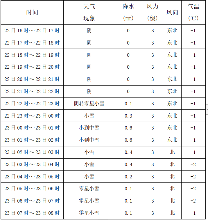 2月22日夜间我市西部小到中雪或冰粒,东部中到大雪或冰粒。最高气温-1~0℃,最低气温-3~-2℃。偏北风3到5级、阵风6到8级。