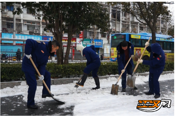 在荆州会议中心前的包保路段上,弥漫风雪中、刺骨寒风里,消防救援人员挥动着铁锹、雪铲等劳动工具,铲的铲、堆的堆,全力对道路中间的积雪和冻冰地面进行清除。尽管脸都冻得通红,但每个人都干劲十足,大家相互配合、齐心协力,干得热火朝天。虽然寒风刺骨,路面湿滑,却丝毫没有挡住“蓝朋友”竭尽所能为群众排忧解难的热情。经过大家协力奋战,很快,道路的积雪被清理得干干净净,方便群众出行。