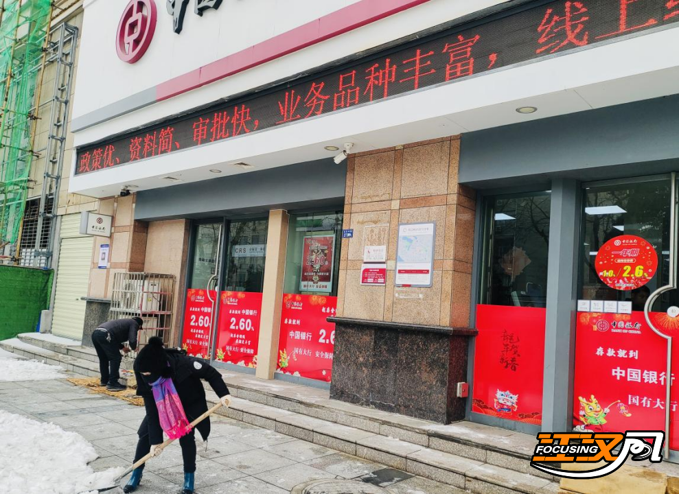 2月22日上午,解放支行积极履行社会责任,清理大门口积雪,保障行人安全,成为一道别样的风景线。