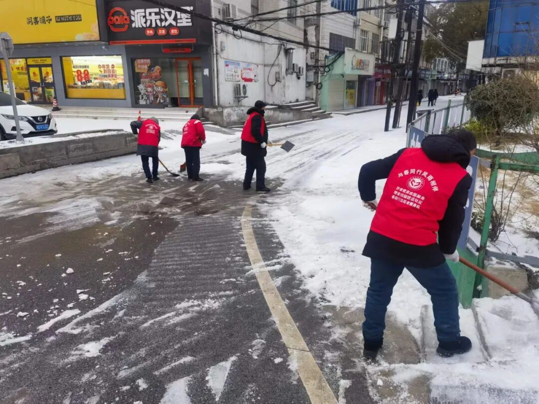 郢都路社区党员志愿者开展铲雪除冰,打通郢都路与背街小巷出入路口。