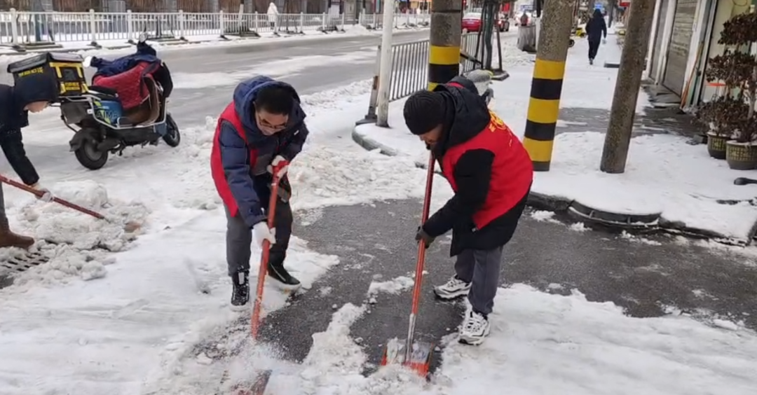 草市社区组织下沉党员干部在草市安全文明小区开展铲雪除冰行动。