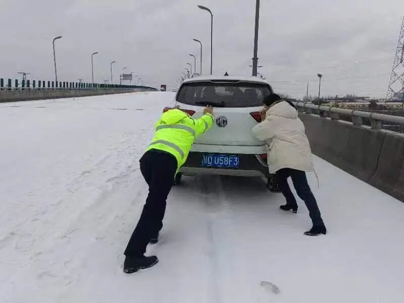 22日上午9时32分,在公安藕池特大桥K20路段,外地车辆雪地被困。荆州高警江南大队民辅警推车救助被困车辆。在这“冻”彻心扉的风雪天里,奋力的“推一把”,让荆州“温暖如春”。