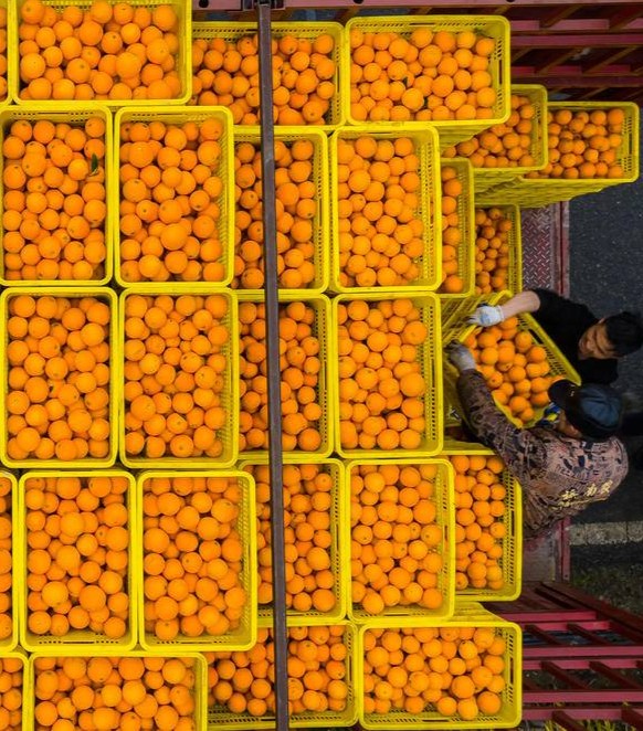 秭归县九畹溪镇桂垭村村民将刚收获的脐橙进行装车。(视界网 郑家裕 梅雪飞 摄)