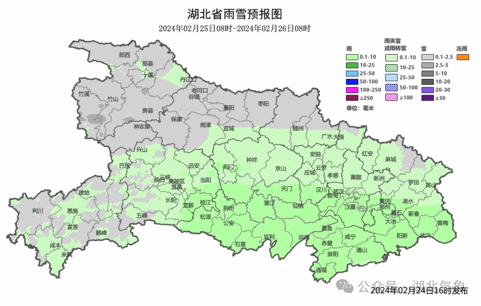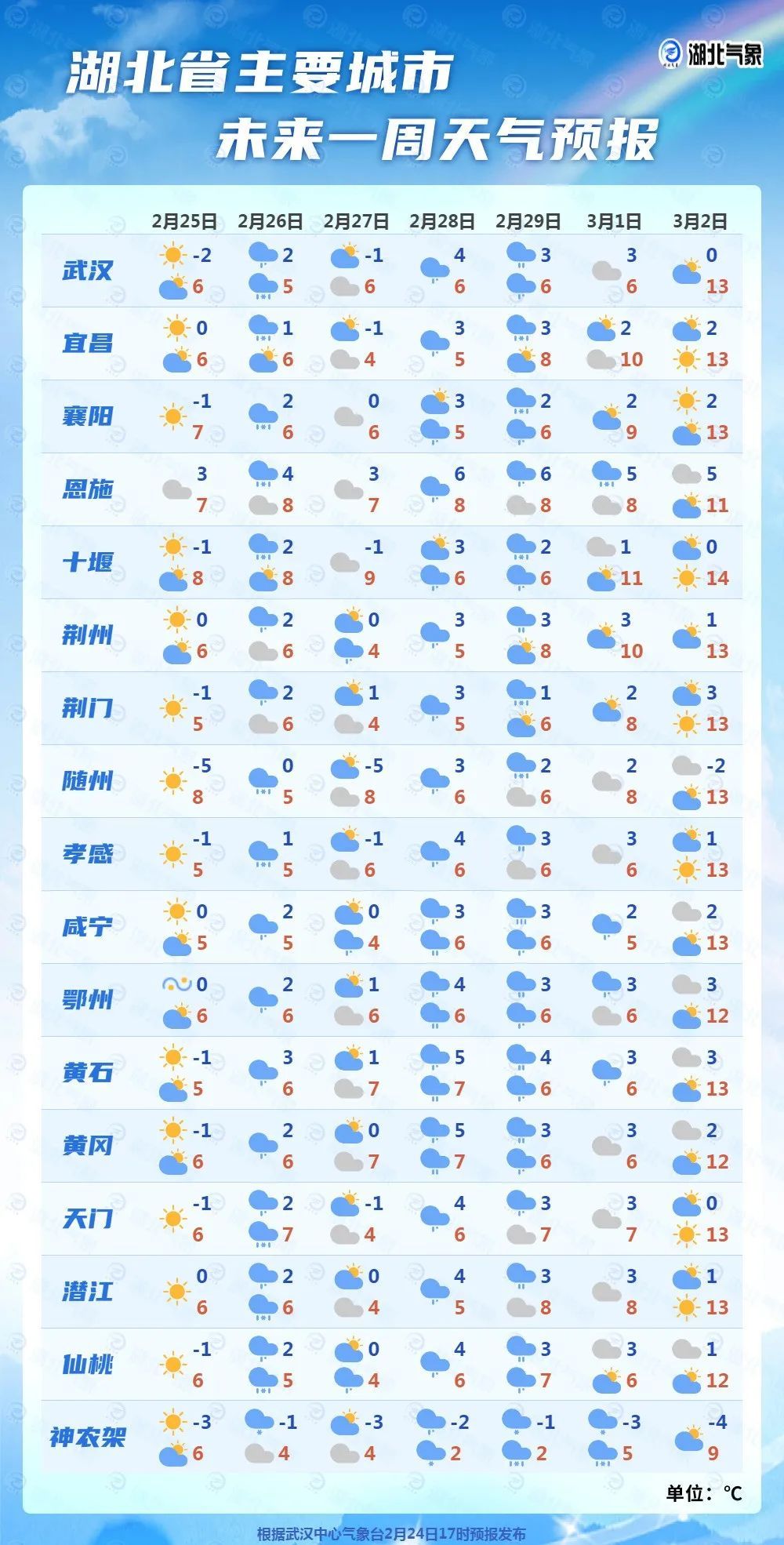 25日08时-26日08时,江汉平原南部、鄂东南阴天转小雨;其他地区阴天转雨夹雪或小雪,其中西部山区局部中到大雪。最高气温大部地区3~7℃;最低气温大部地区-2~2℃。偏北风2到3级。