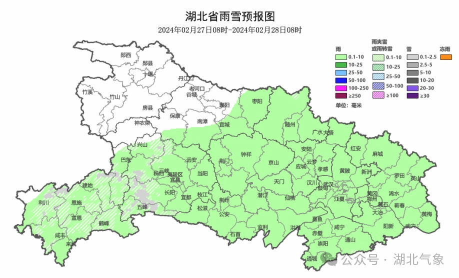 27日08时-28日08时,鄂西北多云到阴天;其他地区阴天转小雨,其中鄂西南局部有雨夹雪或小雪。最高气温大部地区4~8 ℃,最低气温大部地区-2~2℃。偏北风2到3级。