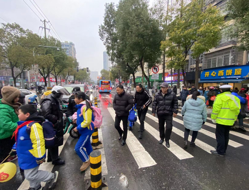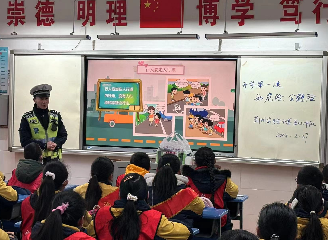 江汉风报道:2月26日,荆州市中小学迎来新学期第一天,荆州交警三大队辖区内各学校附近接送学生的车辆相对集中,人流、车流量较大,校园及周边道路交通压力大增。