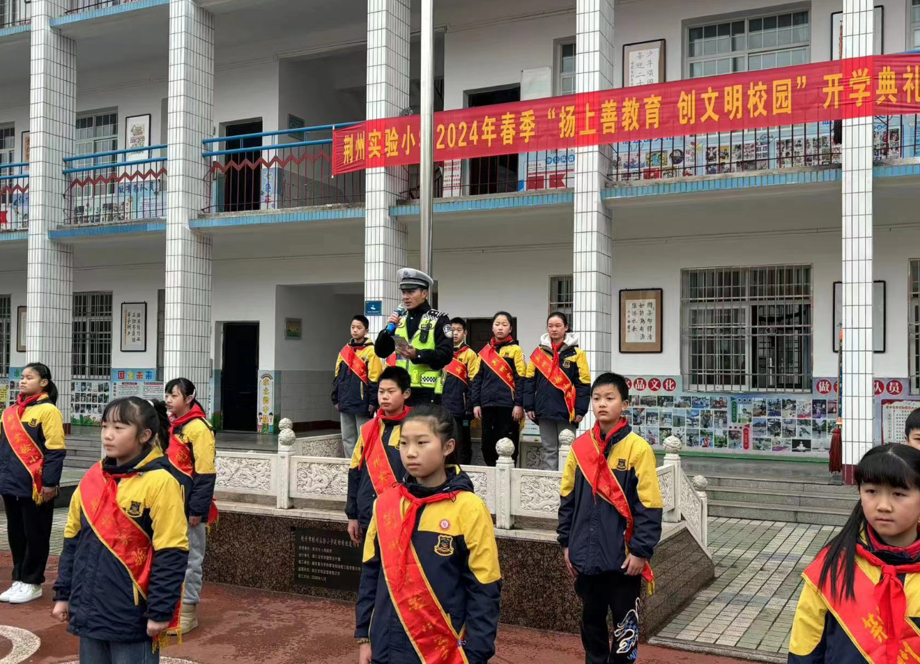 26日上午,荆州市公安局交管局一大队各中队迅速启动护学岗保障秋季开学了,二中队分别来到实验小学城中和城东校区,参加开学典礼,并为孩子们上交通安全课。