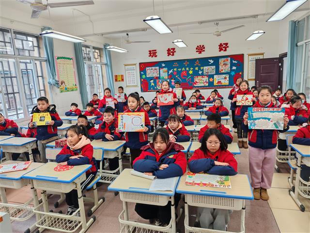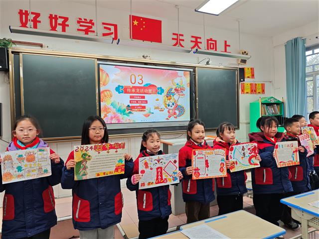 学生们将假期里制作的灯笼、春联、剪纸、手抄报等各式手工作品纷纷带到校园作为展示,为新学期的校园增添了一抹趣意。