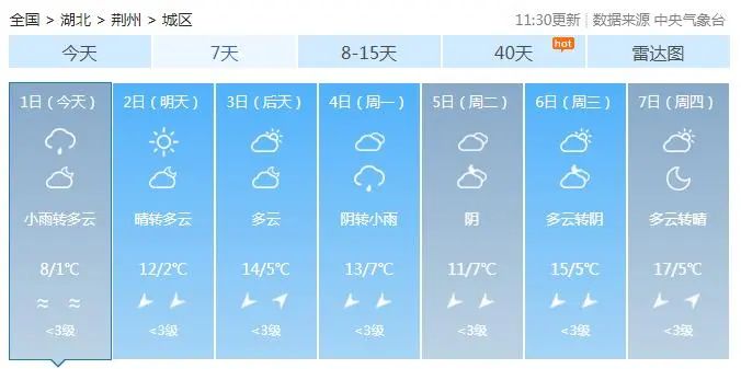 今天,荆州以小雨转多云的天气为主,早晨最低温1℃。明天周六,荆州天气放晴,最高温12℃,后天最高温直达14℃,适宜大家出游。但早晚温差依然较大,大家要合理穿衣,适量加强运动。