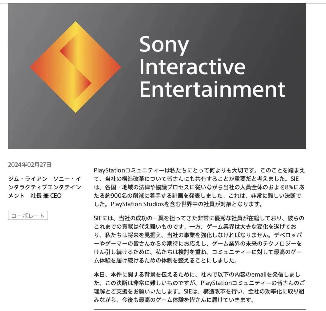 索尼互动娱乐SIE于当地时间2月27日发布声明称,计划开始在全球范围内裁员约8%,规模约900人,主要集中在Play Station业务,从事该业务的英国伦敦工作室将整体关闭,全球其他几个工作室也将受到裁员影响。