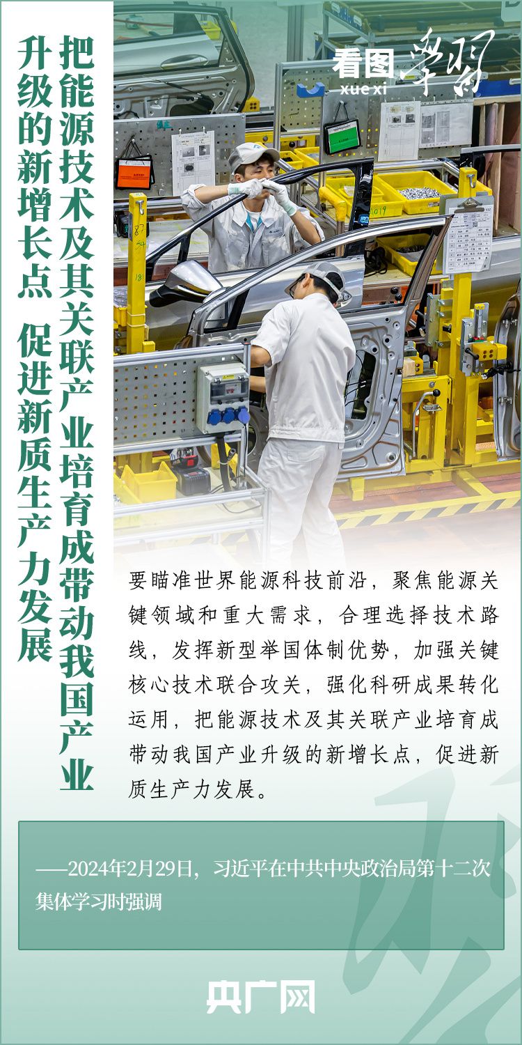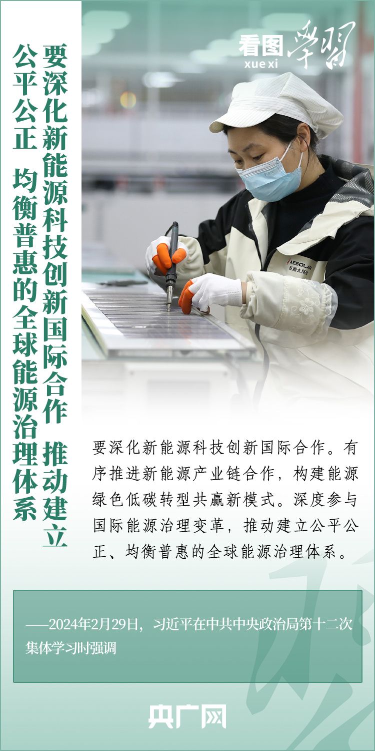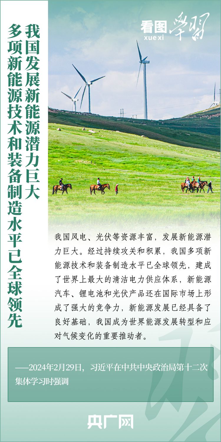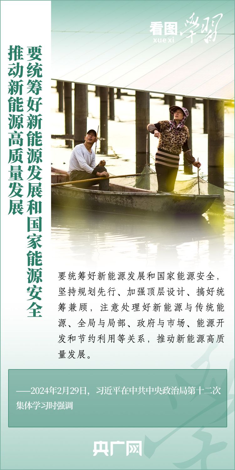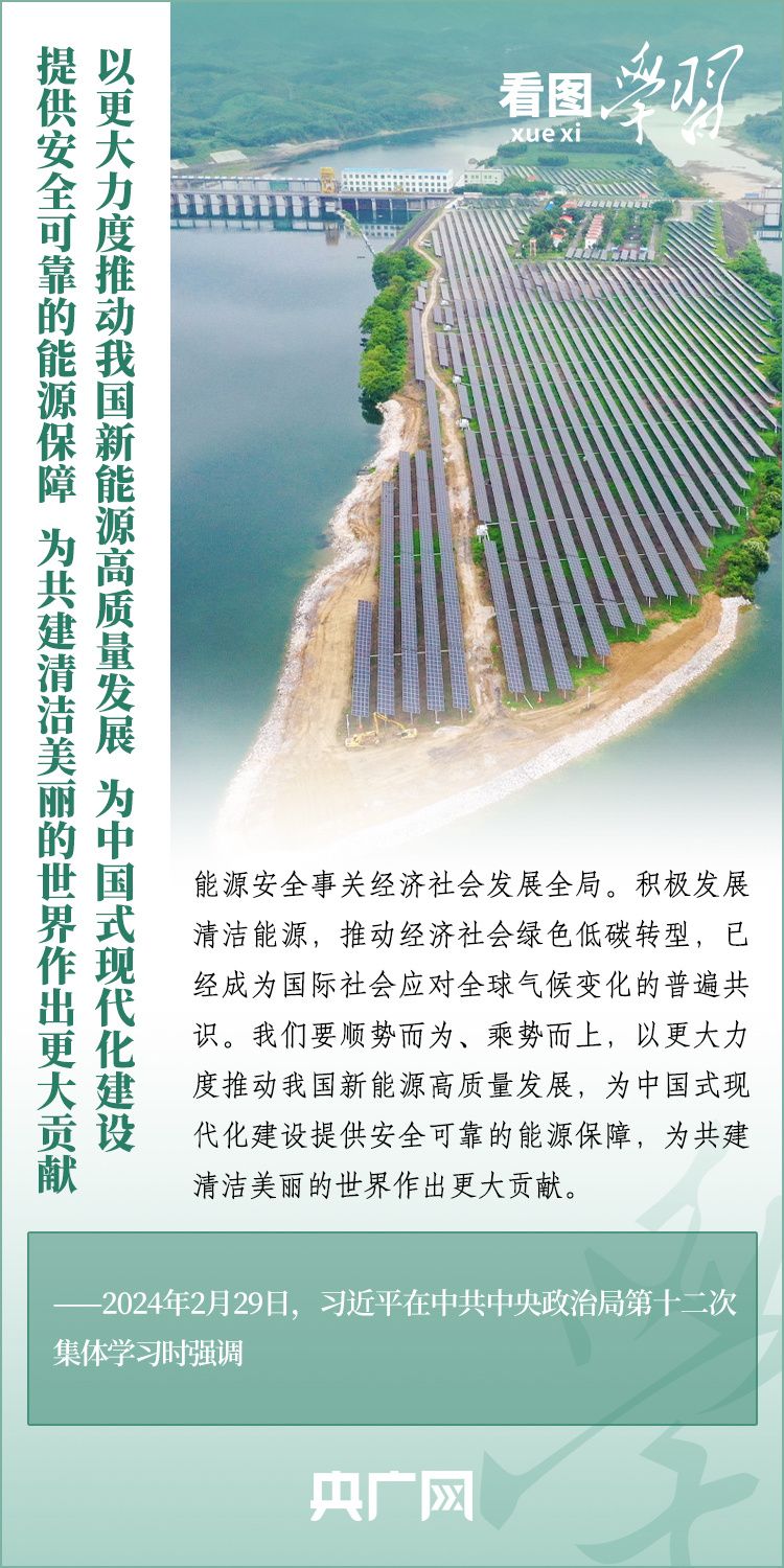 看图学习丨大力推动我国新能源高质量发展 总书记作出全面部署 2024-03-03 08:47 央广网 0 能源安全事关经济社会发展全局。2月29日,习近平总书记在中共中央政治局第十二次集体学习时强调,我们要顺势而为、乘势而上,以更大力度推动我国新能源高质量发展,为中国式现代化建设提供安全可靠的能源保障,为共建清洁美丽的世界作出更大贡献。一起来学习!
