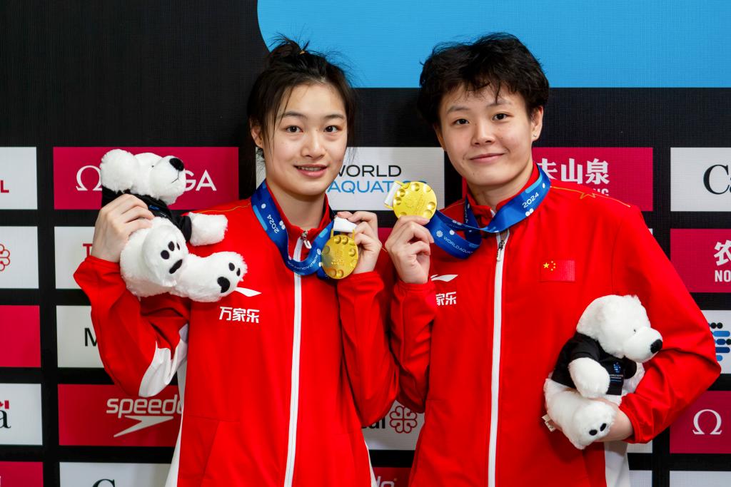 3月3日,中国选手昌雅妮(左)/陈艺文在女子双人3米板颁奖仪式上。新华社发(刘佳欢摄)