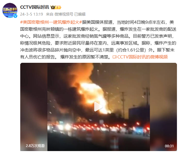 据美国媒体报道,当地时间4日晚9点半左右,美国密歇根州克林顿镇的一栋建筑爆炸起火。据报道,爆炸发生在一家批发商的配送中心。网站信息显示,这家批发商经销氮气罐等多种商品。目前警方已发表声明,称情况极其危险,要求附近居民尽量待在室内、远离事发区域。据称,爆炸产生的冲击波将很多物品碎片抛向空中,最远可达1英里(约合1.61公里)外。眼下暂未有人员伤亡的报告。爆炸发生的原因暂不清楚。