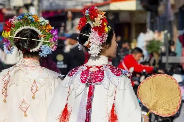 头戴簪花的游客在福建省泉州市蟳埔村游览。新华社记者 魏培全 摄