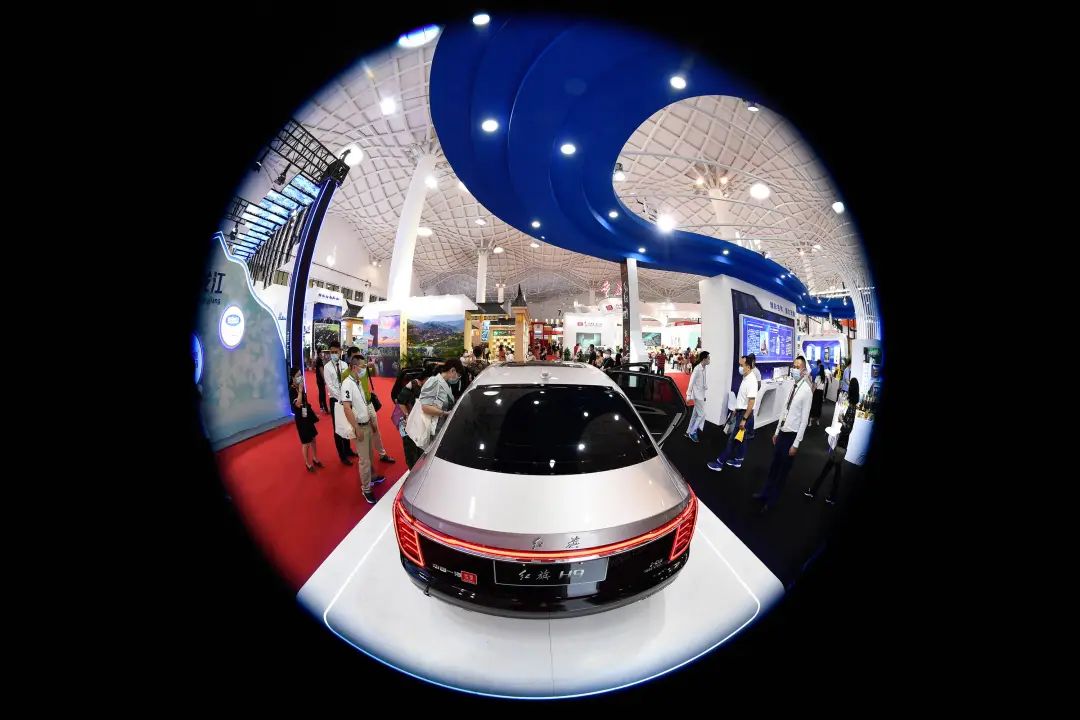 在首届中国国际消费品博览会上,观众在欣赏红旗H9轿车。新华社记者 杨冠宇 摄