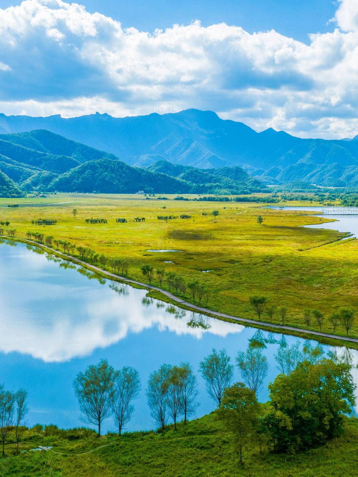 神农架大九湖国家湿地公园,绿水、湿地、白云、蓝天相映成趣,构成一幅美丽的生态画卷。(湖北日报全媒记者 薛婷 通讯员 杜华 摄)