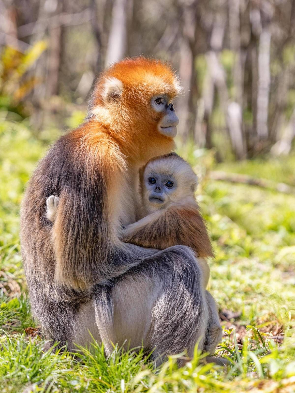 神农架大龙潭金丝猴野外研究基地,金丝猴宝宝或依偎在母亲怀里,或是在丛林间嬉戏觅食。(湖北日报全媒记者 薛婷 通讯员 杜华 摄)
