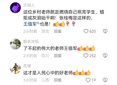 “了不起的伟大的老师王值军”“这才是人民心中的好老师,点赞!”“这位乡村老师就是燃烧自己照亮学生,蜡炬成灰泪始干啊!张桂梅是这样的,王值军也是!”