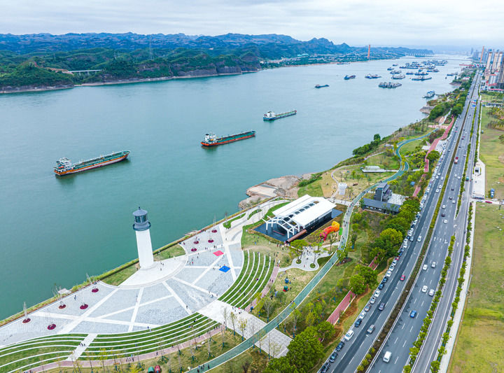 2022年10月5日,市民在湖北省宜昌市滨江公园灯塔广场游玩(无人机照片)。该广场是在实施岸线复绿等综合措施后,由老旧码头改造而成。新华社记者 肖艺九 摄