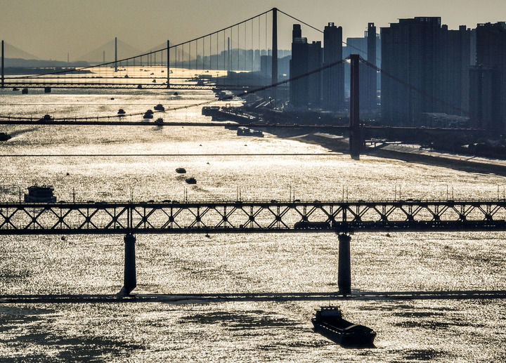 2024年1月23日,一列火车从武汉长江大桥上驶过(无人机照片)。新华社记者肖艺九摄