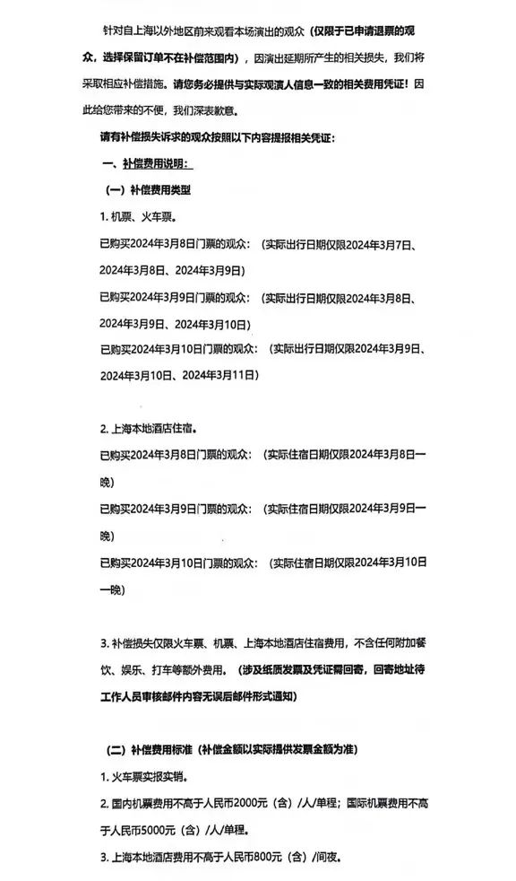 对于已申请退票、来自上海以外地区的观众,将补偿火车票、机票、住宿相关损失。